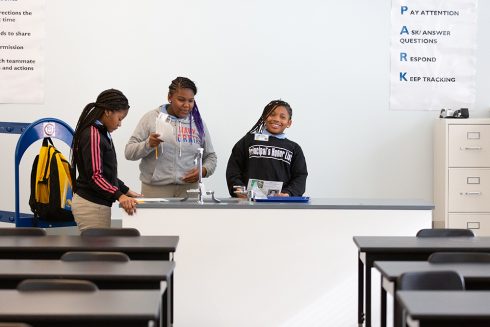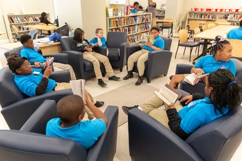 The building is fully renovated and features bright and spacious hallways, modern classrooms, a library, and a gymnasium.